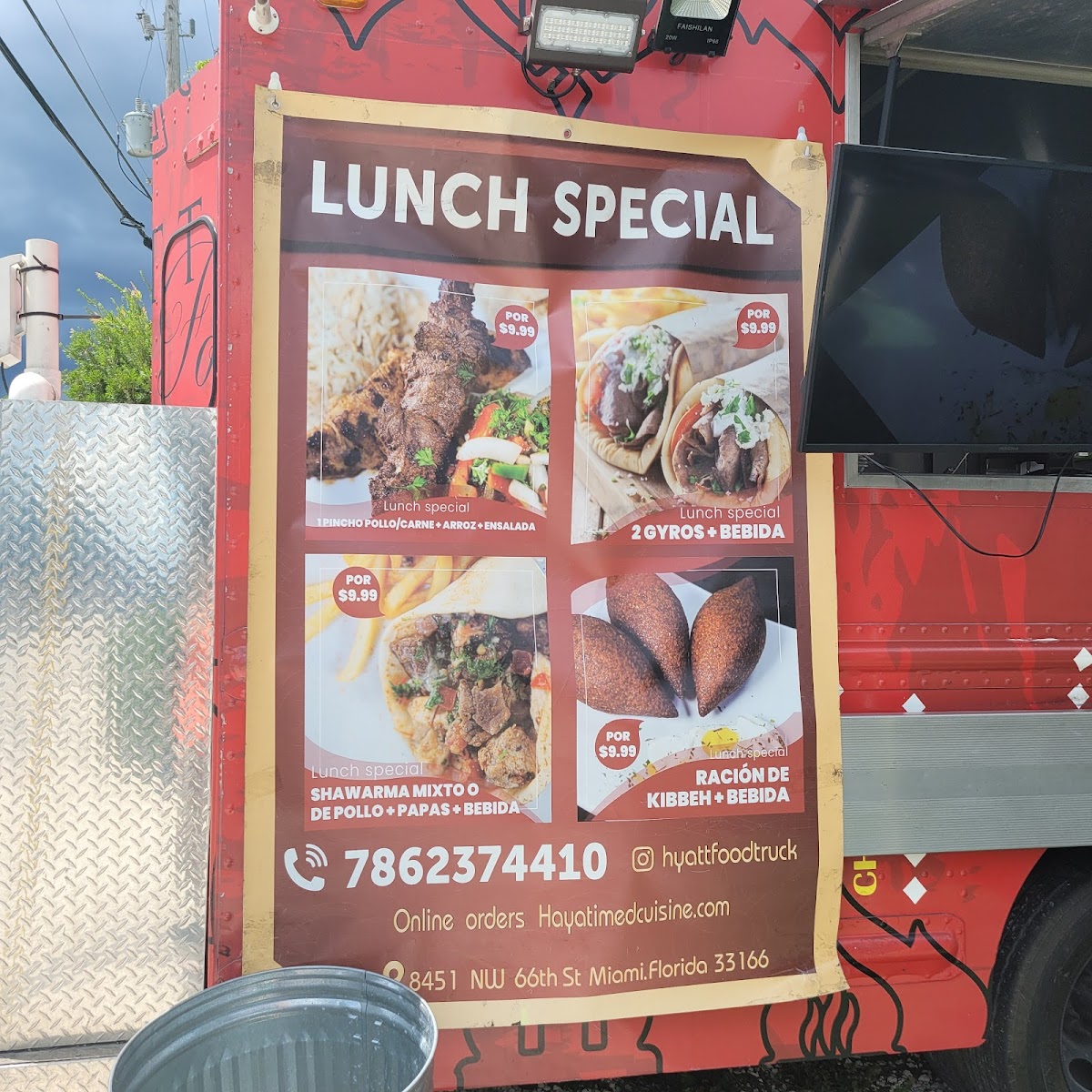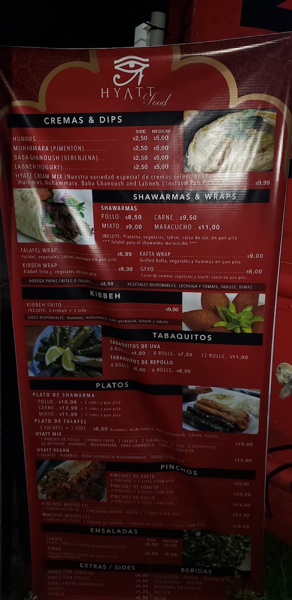 The menu at Hyatt Food Truck offers a delightful array of Mediterranean-inspired dishes. For appetizers, their creams section features the smooth and flavorful Hummus and the rich, spicy Muhammara. Moving on to the wraps, diners can enjoy the savory Gyro Wrap and the tender Chicken Shawarma Wrap, both packed with bold flavors. For those craving something more traditional, the restaurant offers Grape Leaves and Cabbage Leaves, which provide a delicious, bite-sized option. The plates section includes heartier meals like the tender Shawarma Platter, the crispy and satisfying Falafel Platter, and the flavorful Grilled Kebab Skewers Plate. Finally, the refreshing Tabule Salad is a perfect light complement to any dish. Each option brings a unique taste of the Mediterranean, making this food truck a great choice for anyone looking for fresh, flavorful dishes in Miami.